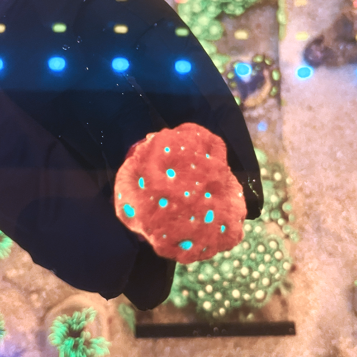 O Favia Alien Eye é um coral LPS de coloração única e impactante, com pólipos verde-limão brilhantes no centro, cercados por tecido vermelho ou bordô escuro. Seu padrão lembra “olhos alienígenas” e cria um contraste marcante sob luz azul. De crescimento lento e fácil de cuidar, é ideal para dar um toque exótico ao seu layout.